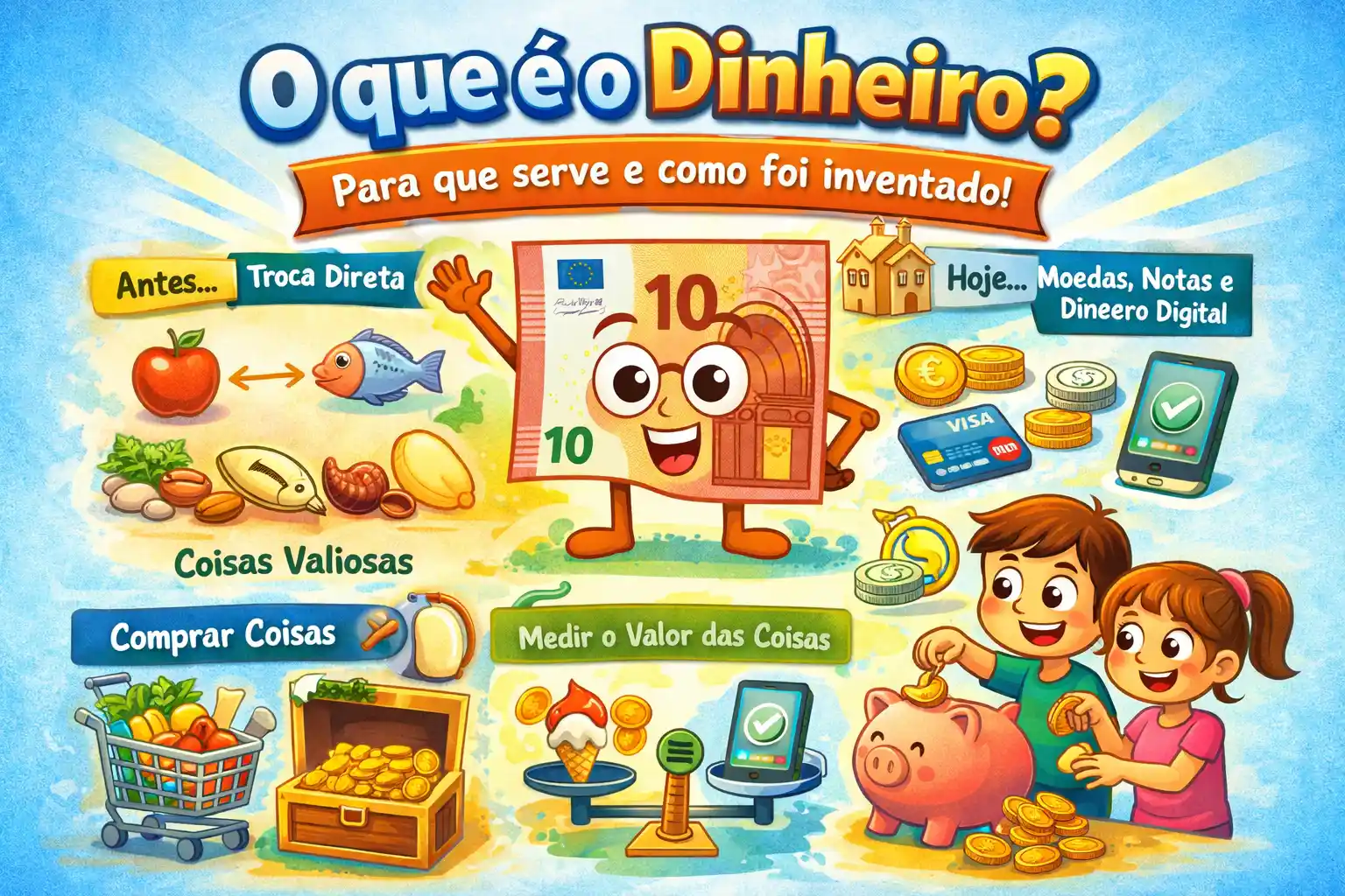 • Dinheiro → Uma ferramenta usada para comprar coisas e trocar por bens ou serviços